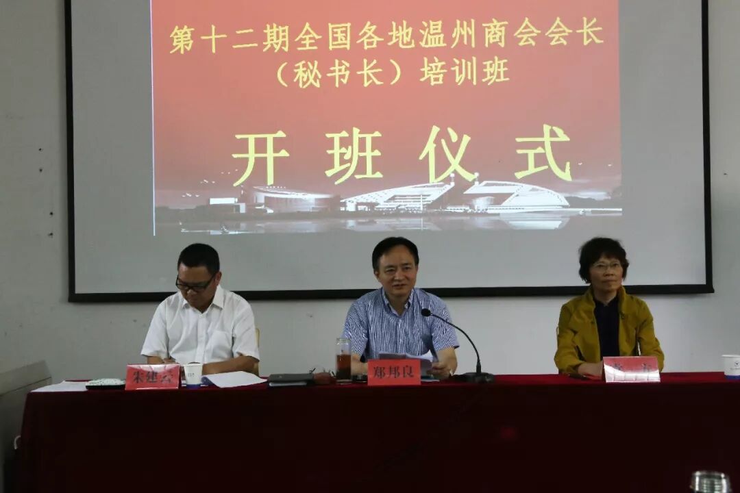 5月23日上午,第十二期全国各地温州商会会长(秘书长)培训班开班仪式率先举行!温州市政府副秘书长、温州市招商局(经合办)局长(主任)、温州市全国温州商会总会执行会长郑邦良,温州市招商局(经合办)副局长(副主任)、温州市全国温州商会总会秘书长朱建云,浙江大学继续教育学院原副院长袁芳出席了开班仪式。